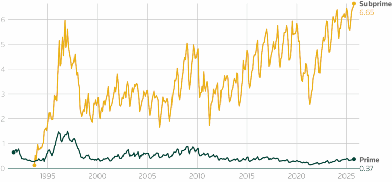 Auto loan delinquencies in the United States are rising faster than expected, with subprime borrowers under the greatest pressure. In October, Reuters reported that the share of subprime borrowers at least 60 days behind on their auto loans climbed to 6.65 percent, the highest level on record since the early 1990s. For prime borrowers, Reuters noted that the 60-day delinquency rate held steady at 0.37 percent, unchanged from both the previous month and the prior year. The widening gap between prime and subprime highlights how concentrated, yet severe, the emerging stress has become.